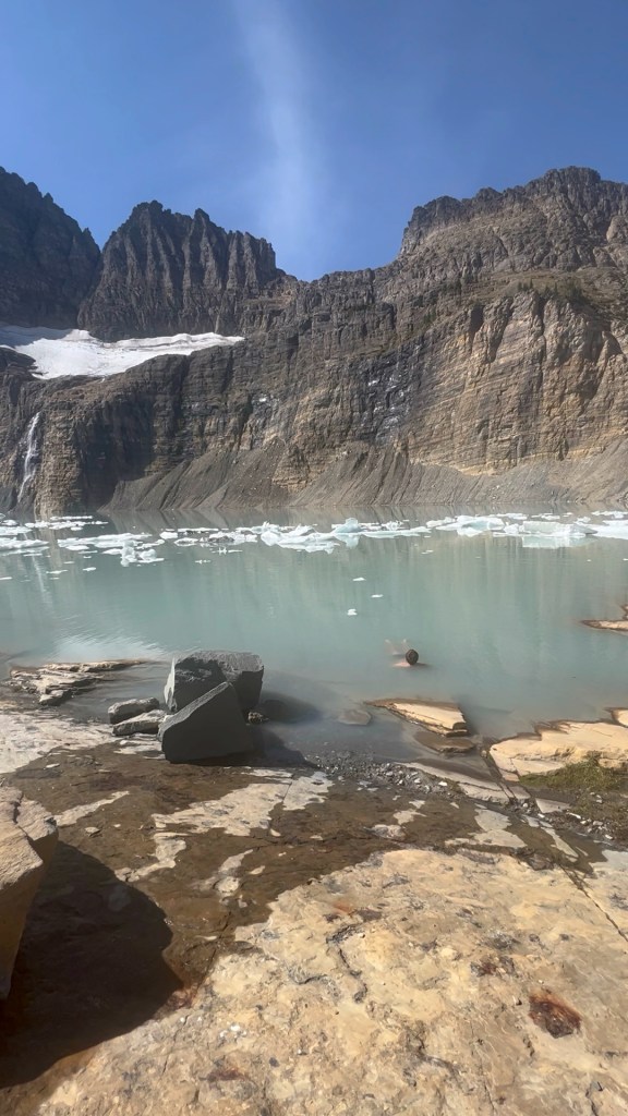 The eerie green glow of Grinnell Lake is caused by mineral sediment that comes from runoff from the melting glaciers and collects at the bottom of the lake. The park is filled with these two hundred foot waterfalls formed from the melting glaciers. People come from all over to see the waterfalls and some are even brave (or crazy) enough to swim in the sub 40 degree water in the alpine lakes. That last picture is me plunging in the glacial melt from Grinnell Glacier. I had a spiritual experience laying in the water for 90 seconds – I saw the whole life of the glacier flash before my eyes. Visually, it was astonishing the rapid changes that have taken place in the last couple hundred years. It dawned on me that the beauty of the waterfalls is undermined by the sad reality that they are evidence of melting glaciers. It fills me with sorrow to share the statistic that was shared with me during my visit to Glacier National Park: