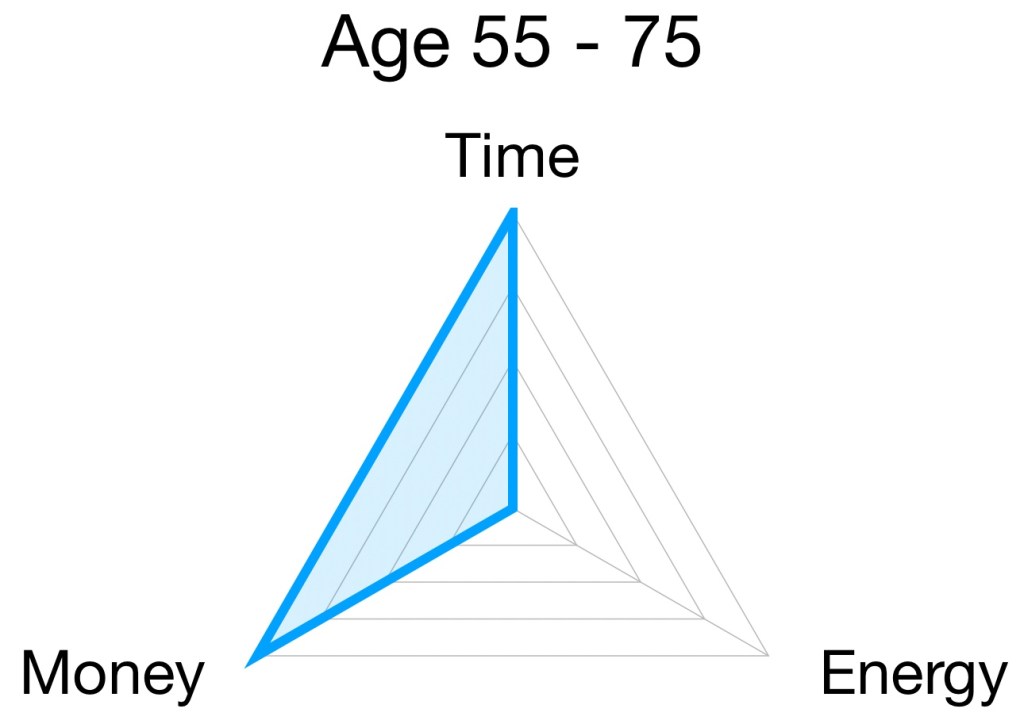 It’s a model of the opportunity surface and associated tradeoffs present in most people’s life. On the points of this triangle are your Time, Energy, and Money. The idea is the surface morphs as we age. I believe it morphs as the priority of our highest values change. The age ranges used in the following charts are illustrious and not meant to cover all possible circumstances.