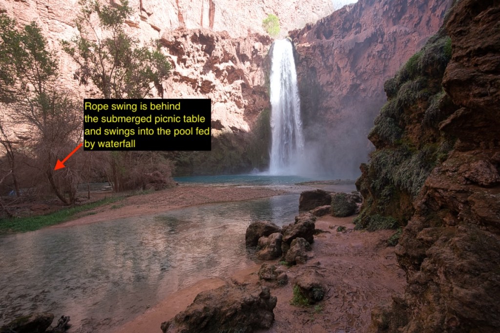 After rolling down the hill full of fry bread, I headed back to my tent. I ran into Annie from the morning plunge who informed me of the hidden rope swing behind the submerged picnic table by Mooney Falls. Having crossed the three mile hike to Beaver Falls off the agenda, I decided to see what this rope swing was all about. Nothing brings out the inner child like a good rope swing over a waterfall into a deep body of water!
