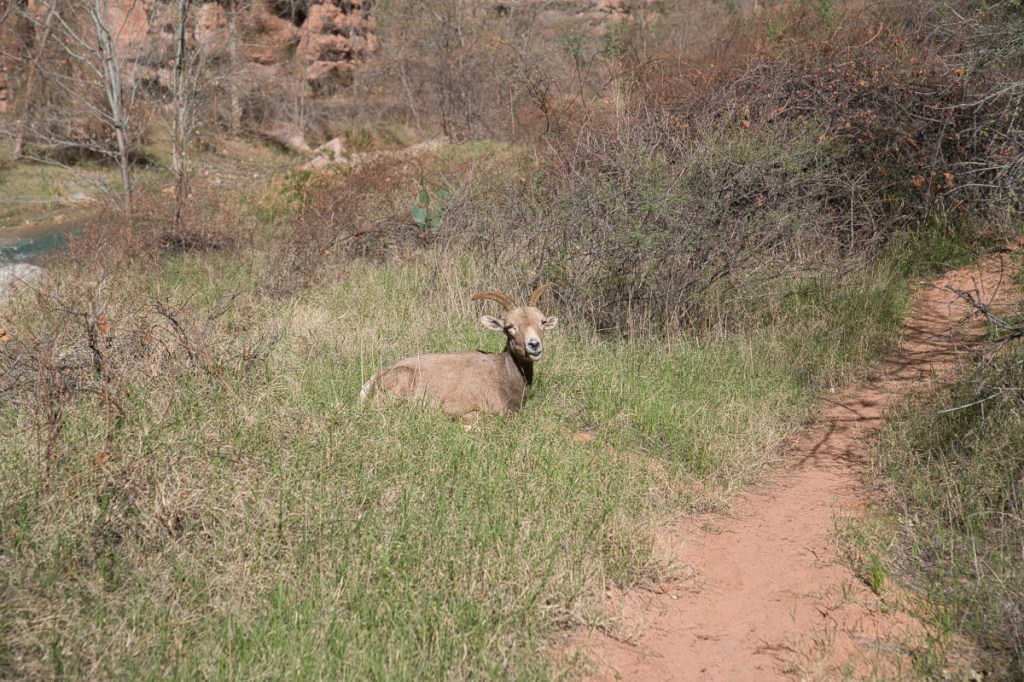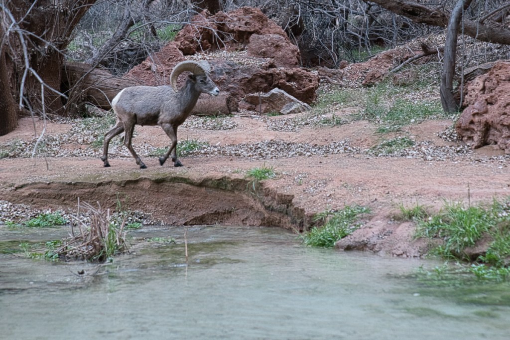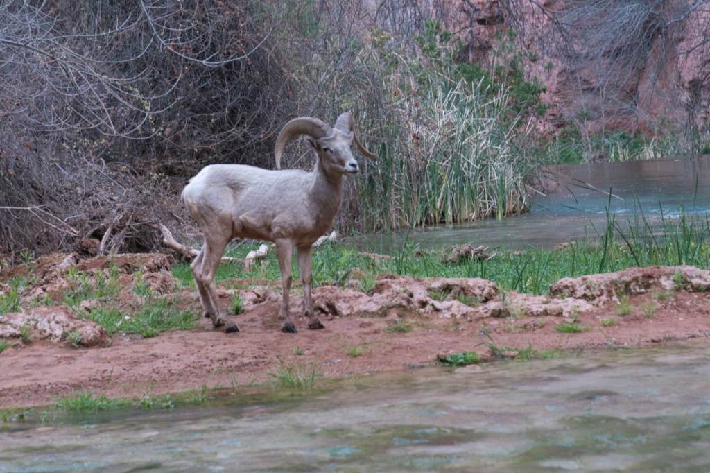 I embarked on this adventure in early March, smack in the middle of Bighorn Sheep mating season; was fortunate enough to see ten Bighorns on the journey to and from The Confluence. It was a blessing to see the bighorns scrambling up the rocks of the canyon face, splashing about as they crossed the stream, and being more-or-less at ease with my presence. These animals are beautiful, athletic, and gentle; one Bighorn was lazily napping along the trail and allowed me to pass without a fuss (although he did snort at me as I passed – my heart was jumping out of my chest at this point). Here are a few shots I was able to get of these majestic animals in their natural habitat: