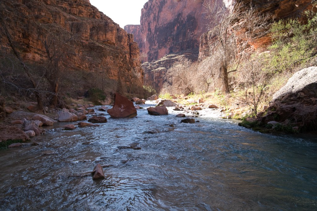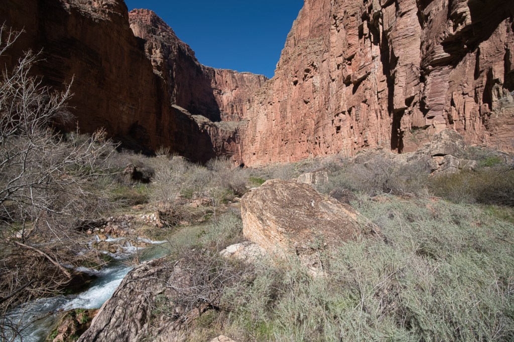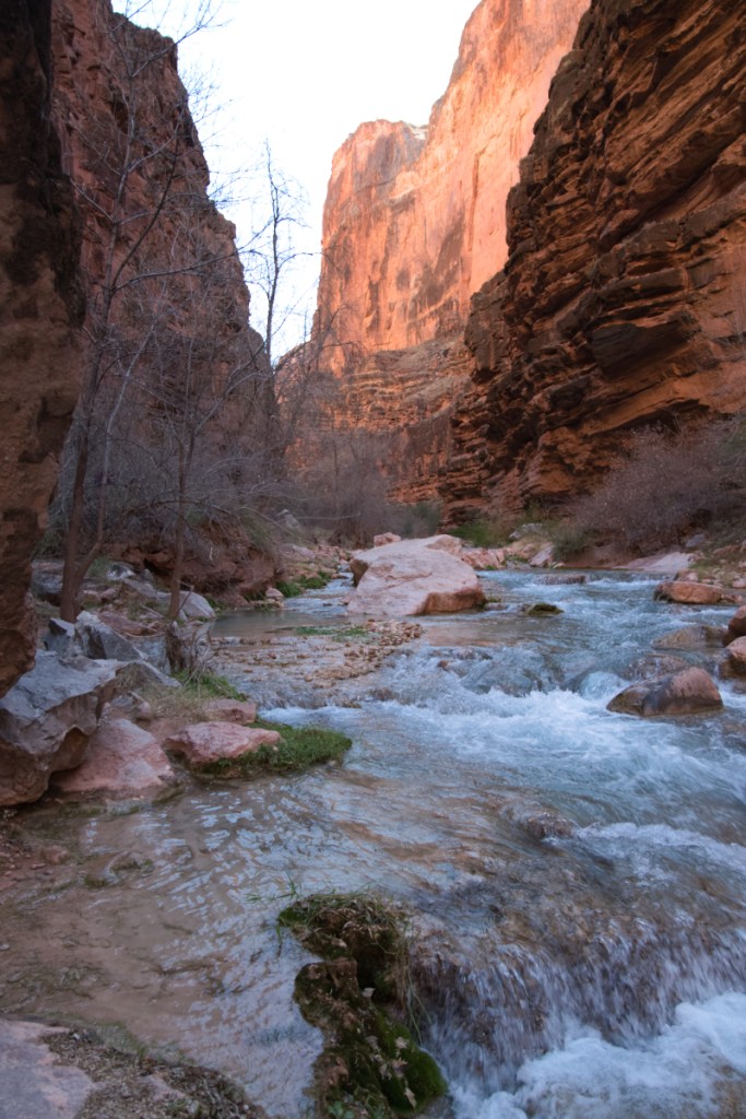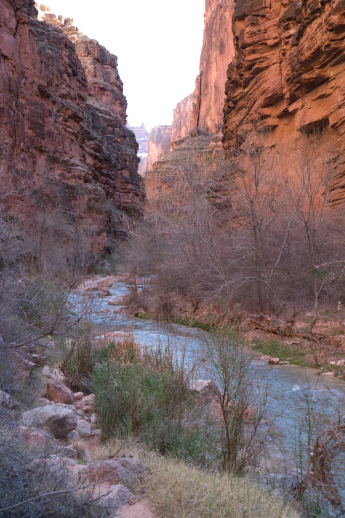 The trail is super remote as you are 20 miles from Supai and another 70 miles away from old Route 66. I went solo in sandals and was sketched out a few times as there are 10+ river crossings (some are waist high running water), a rocky descent down into the canyon; the trail was overgrown and hard to follow, especially on the way back. I haven’t hiked the Grand Canyon rim-to-rim yet, but I can imagine this is what it must feel like. Seeing how the lighting in the canyon changes from early morning to late afternoon was a real treat. The canyon walls rise a couple hundred feet above you on other side as you follow the winding turquoise-blue stream, contributing to a feeling of being minuscule.