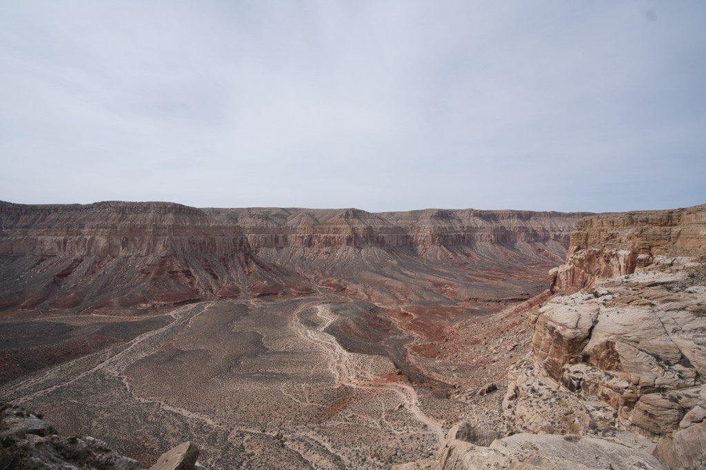 The drive from mile marker one to mile marker 30 was a little sketchy with all the snow whipping around. I was relieved when the flurry broke as I approached the Havasupai trailhead. It’s worth noting that I didn’t get stopped at the ranger station, as the place appeared to be vacant. Pulling up to the trailhead, I was in awe as the canyon landscape reminiscent of the Grand Canyon came into view in the wee morning twilight.
