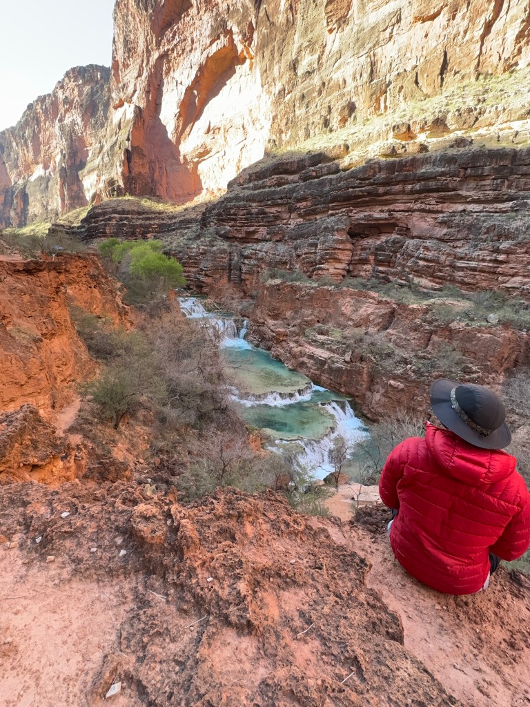 Setting up camp was a breeze, I was able to score a coveted spot just above Mooney Falls that still had a bit of a rock wall built in to shield against the wind. Naturally, the universe had an important lesson in store for me: DON’T WALK AROUND THE CAMPSITE BAREFOOT. Rocks are sharp and the skin on our feet is soft – I tore open a callus on the bottom of my foot, ten minutes after successfully setting up camp! Thankfully I brought a first aid kit and treated the wound with antibacterial wipes and antibiotic ointment at the end of each day. The only downside to my campsite is the half mile walk back to the drinking water source at Fern Spring. I’ve gotten to know some of the other groups of campers by virtue of making the trip to and from the spring multiple times. There are people from all over the map here at Havasupai campgrounds. It’s interesting to hear the different languages being spoken and the makeup of various groups. Many young people are here with their friend(s) or partner. Some brought three generations of family out. Some packed way, way too much. The “readiness” levels of different groups is an interesting sight to behold. The guy across the stream from me had tents, hammocks, chairs, a stovetop, even Christmas lights strung up around his campsite; I thought I had overpacked! Wanderlust and appreciation for the waterfalls and crystal blue water seems to be a universal language.
