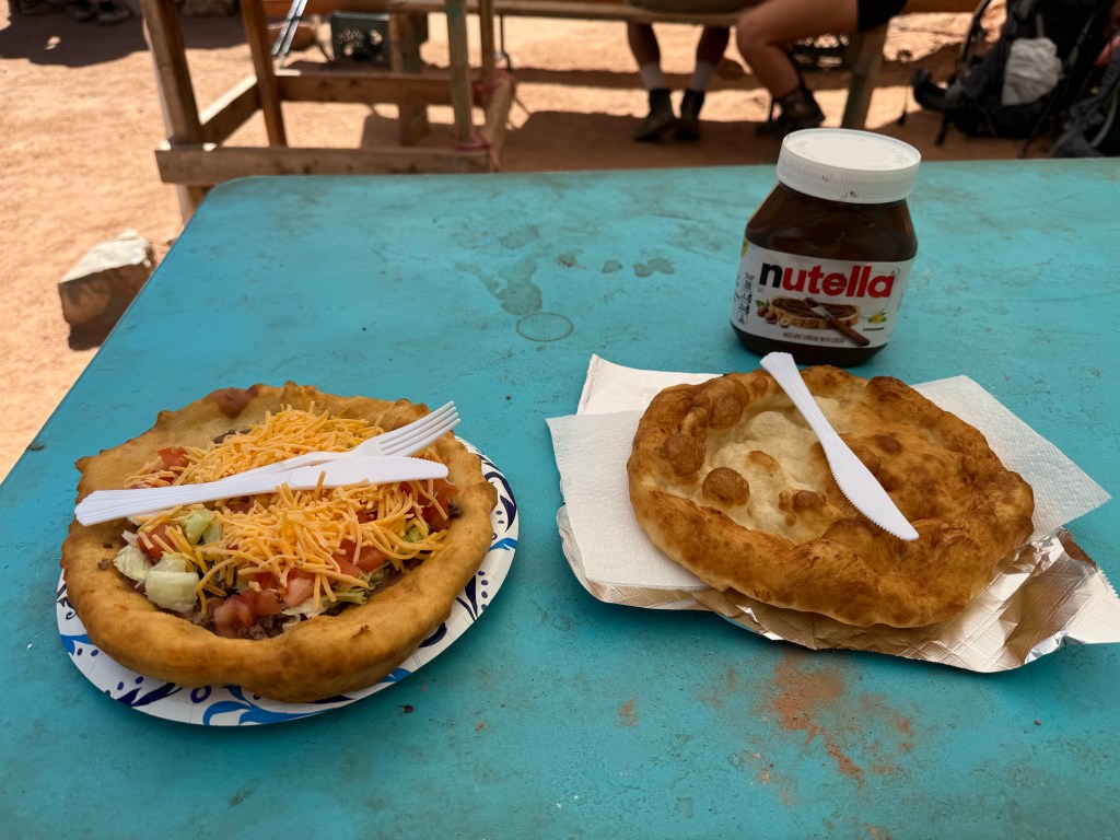 Oh. My. God. Y’all. The fry bread is DANK. I don’t know if it’s because I’ve been living off freeze dried meals for two days, but this fry bread slaps. Initially I placed an order for the Indian Taco (fry bread, bean spread, ground beef, cheese, tomato, lettuce) then said “fuck it!” and ordered a plain fry bread to dress up with honey, powdered sugar, cinnamon, and Nutella. There’s something about greasy, sugary food while you’re camping that just hits different.